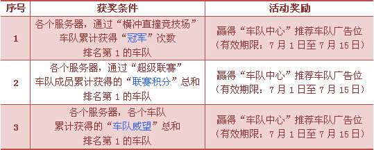 3. 活动期间,假如多支车队获得的“横冲直撞竞技场”冠军次数相同,则取车队威望最高的那支车队为获奖车队;车队威望数据截至活动数据统计时;