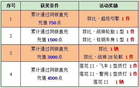 2. 活动统计为累计充值达成序号4可拿全部奖励,限定网银直充途径;