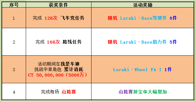 4. 序号1活动,需跑完飞车党任务跳出结算页面,未跑完或中途退出不做累计;