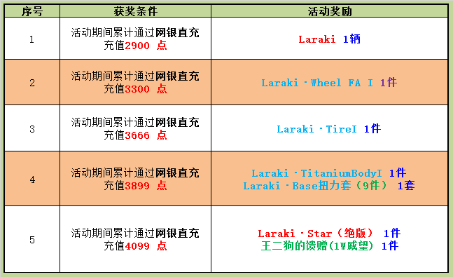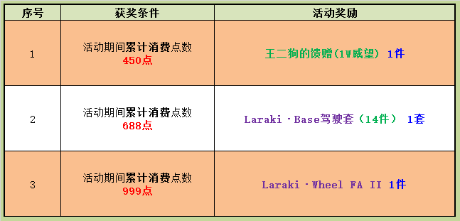2. 活动统计为累计消费,不包含车队注资及寄售购买点数道具等;