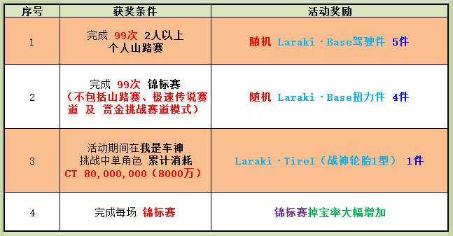 6. 序号3活动,我是车神统计以通行证下完成消耗最多的角色进行单独统计,只统计完成与否,不统计是否刷新记录,同一通行证多个角色完成只发放一份奖励;