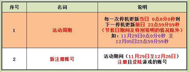 2. 序号1到4活动在活动时间(11月29日至12月26日)内仅限完成一次,某个<活动周期>内完成后,下一<活动周期>将不进行统计;某个<活动周期>内未完成的活动,在活动时间内仍可完成;