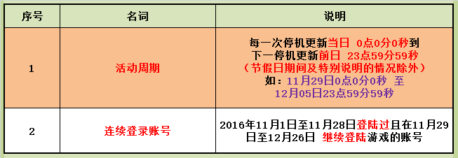 2. 序号1到5活动在活动时间(11月29日至12月26日)内仅限完成一次,某个<活动周期>内完成后,下一<活动周期>将不进行统计;某个<活动周期>内未完成的活动,在活动时间内仍可完成;