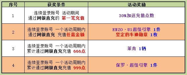 4. 活动统计为累计充值,序号1、2、3、4限定网银直充途径;