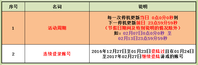 3. 特别说明:春节期间(2017年1月24日至2月6日)的所有活动奖励,将于2月7日、8日统一发放;