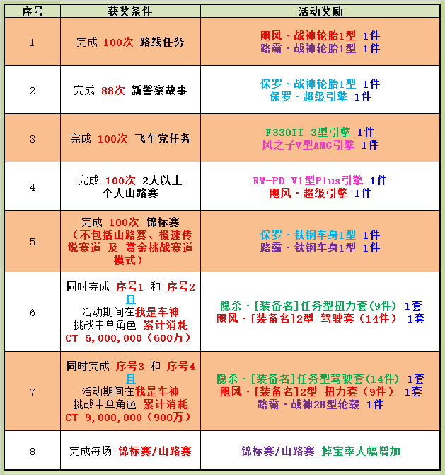 10. 序号7活动,需要同时完成3项任务:序号3、序号4和我是车神累计消耗900万 CT;我是车神统计以通行证下完成消耗最多的角色进行单独统计,只统计完成与否,不统计是否刷新记录,同一通行证多个角色完成只发放一份奖励;