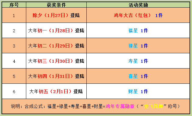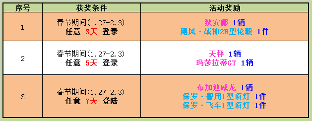 3. 序号1、序号2及序号3活动,不需要连续登录;在春节期间累计登录的天数达到要求即可。如:玩家分别于1月27日、28日、2月1日登录,记为完成任意3天登陆;