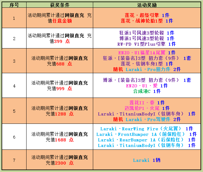 2. 活动统计为累计充值,序号1、2、3、4、5、6限定网银直充途径;