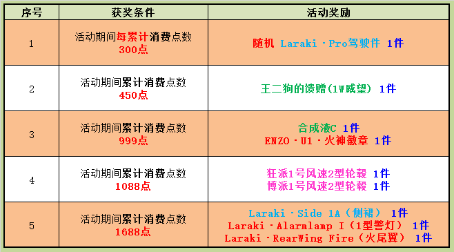 2. 活动统计为累计消费,不包含车队注资及寄售购买点数道具;