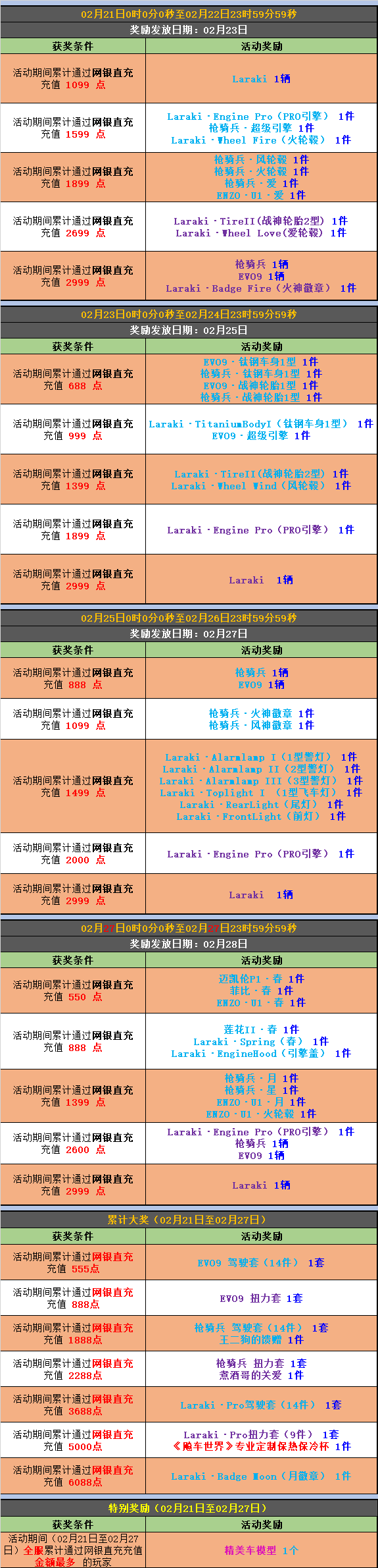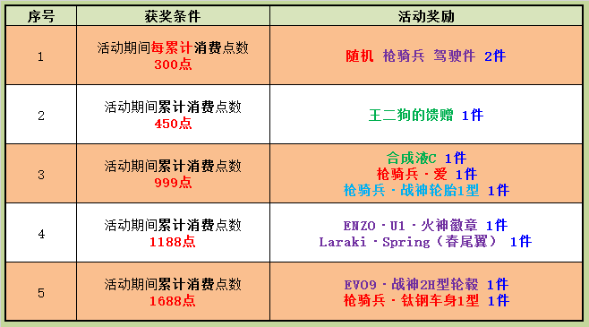 2. 活动统计为累计消费,不包含车队注资及寄售购买点数道具;