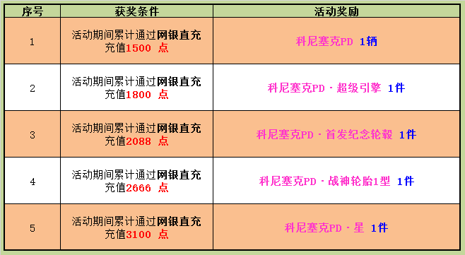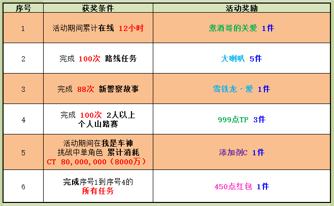 1. 序号1至5活动奖励由系统即时颁发,请在完成相应任务后于游戏中领取;