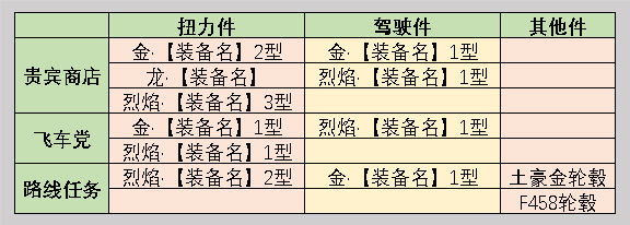 新手车相关装备产出: