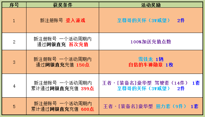 6. 活动统计为累计充值,序号2、3、4、5限定网银直充途径;
