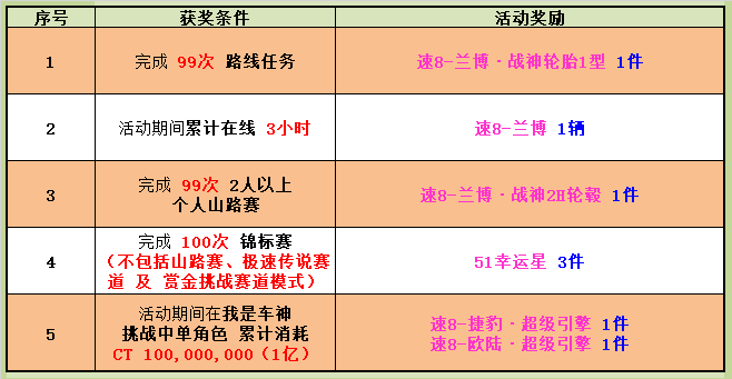 9. 序号5活动,我是车神统计以通行证下完成消耗最多的角色进行单独统计,只统计完成与否,不统计是否刷新记录,同一通行证多个角色完成只发放一份奖励;
