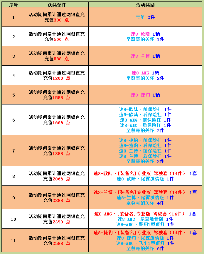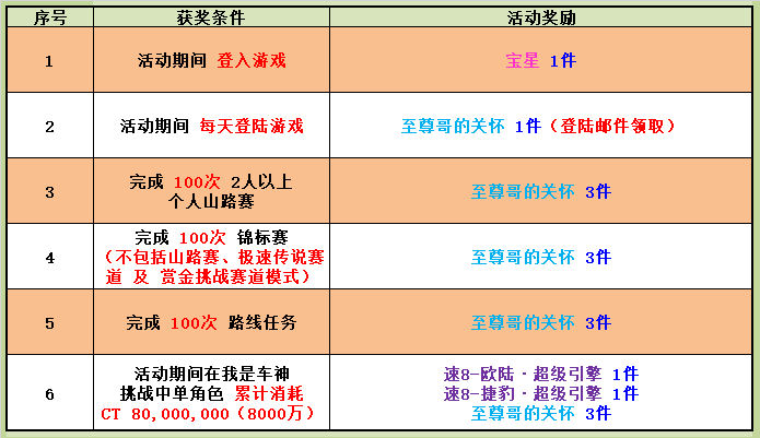 1. 序号1至5活动奖励由系统即时颁发,请在完成相应任务后于游戏中领取;