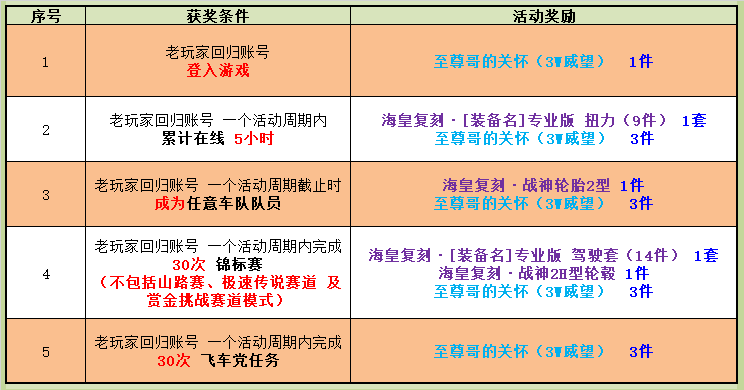 1. 老玩家回归账号:07月04日前注册且07月04日至07月31日未登陆过游戏的,在08月01日至08月07日期间登陆服务器的角色,有多个角色的账号只限领取一份奖励;