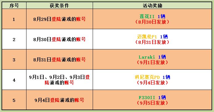1. 序号1至5活动奖励由系统即时颁发,请在完成相应任务后于游戏中领取;