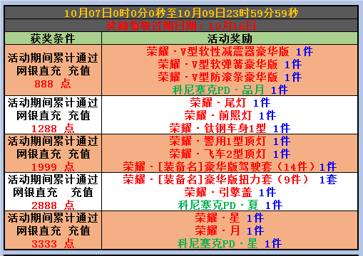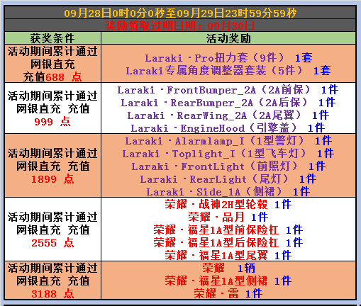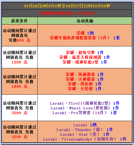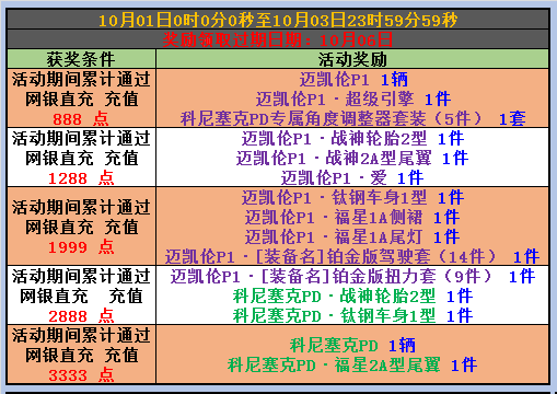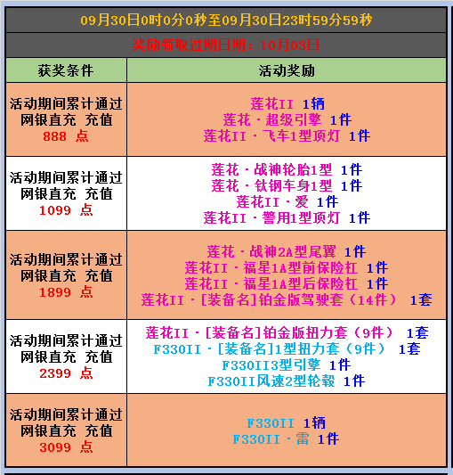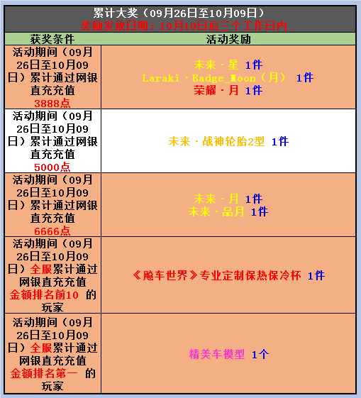 5. 累计大奖活动将于9月29日、9月30日分别查询并提前发放,未能于9月30日之前达成的将统一于10月10日之后三个工作日内发放;