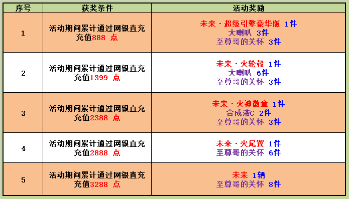1. 序号1至5活动奖励由系统即时颁发,请在完成相应任务后于游戏中领取;