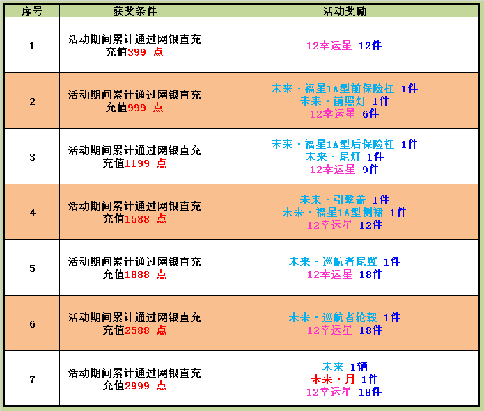 2. 活动1-7统计为累计充值,限定网银直充途径;