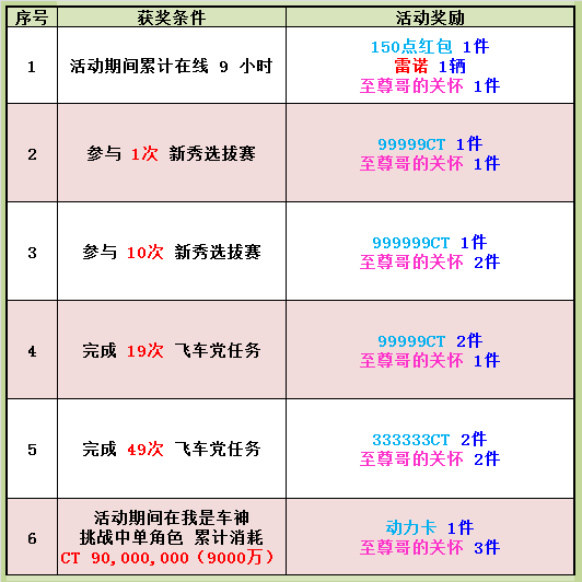 7. 序号6活动,我是车神统计以通行证下完成消耗最多的角色进行单独统计,只统计完成与否,不统计是否刷新记录,同一通行证多个角色完成只发放一份奖励;