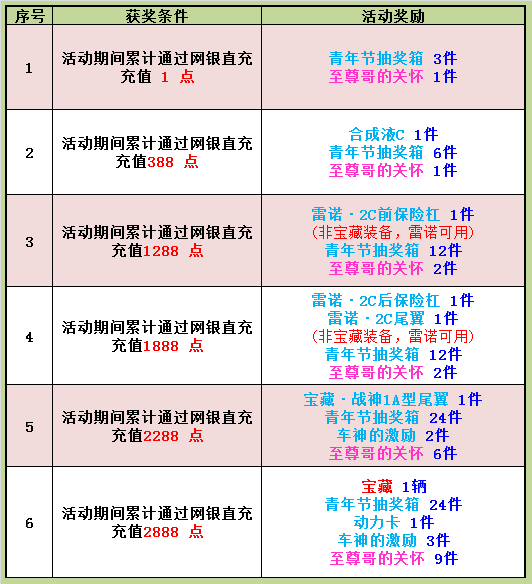 1. 序号1至5活动奖励由系统即时颁发,请在完成相应任务后于游戏中领取;