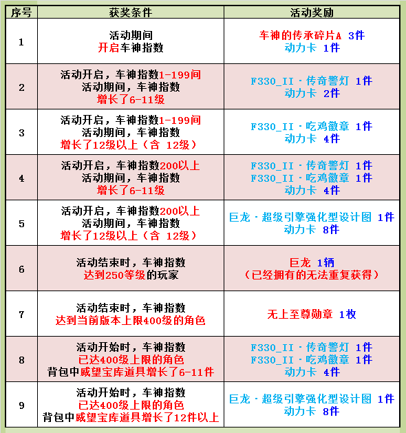 7. 活动序号6,车神指数在活动开启时已达成250等级,不再额外发放巨龙车辆;