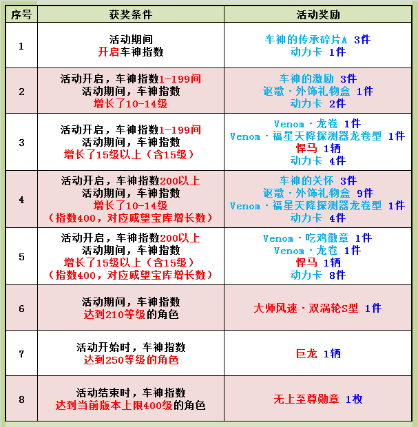 6. 活动序号6,车神指数在活动开启时已达成250等级,不再额外发放巨龙车辆,同理序号1、7、8亦不额外重复发放;