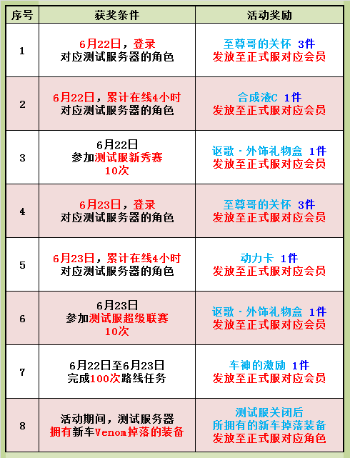 5、 序号1-7活动,所以发往会员中心的,单个会员仅可获得1份活动奖励,无法重复获得单项活动奖励多次,若条件满足1-7活动奖励单会员均可获得1份活动奖励;