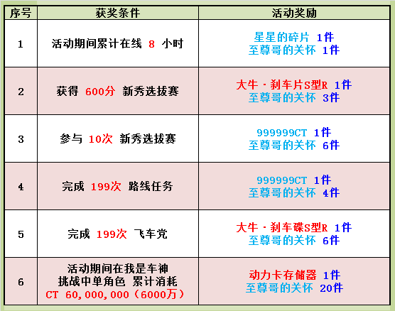 8. 序号6活动,我是车神统计以通行证下完成消耗最多的角色进行单独统计,只统计完成与否,不统计是否刷新记录,同一通行证多个角色完成只发放一份奖励;